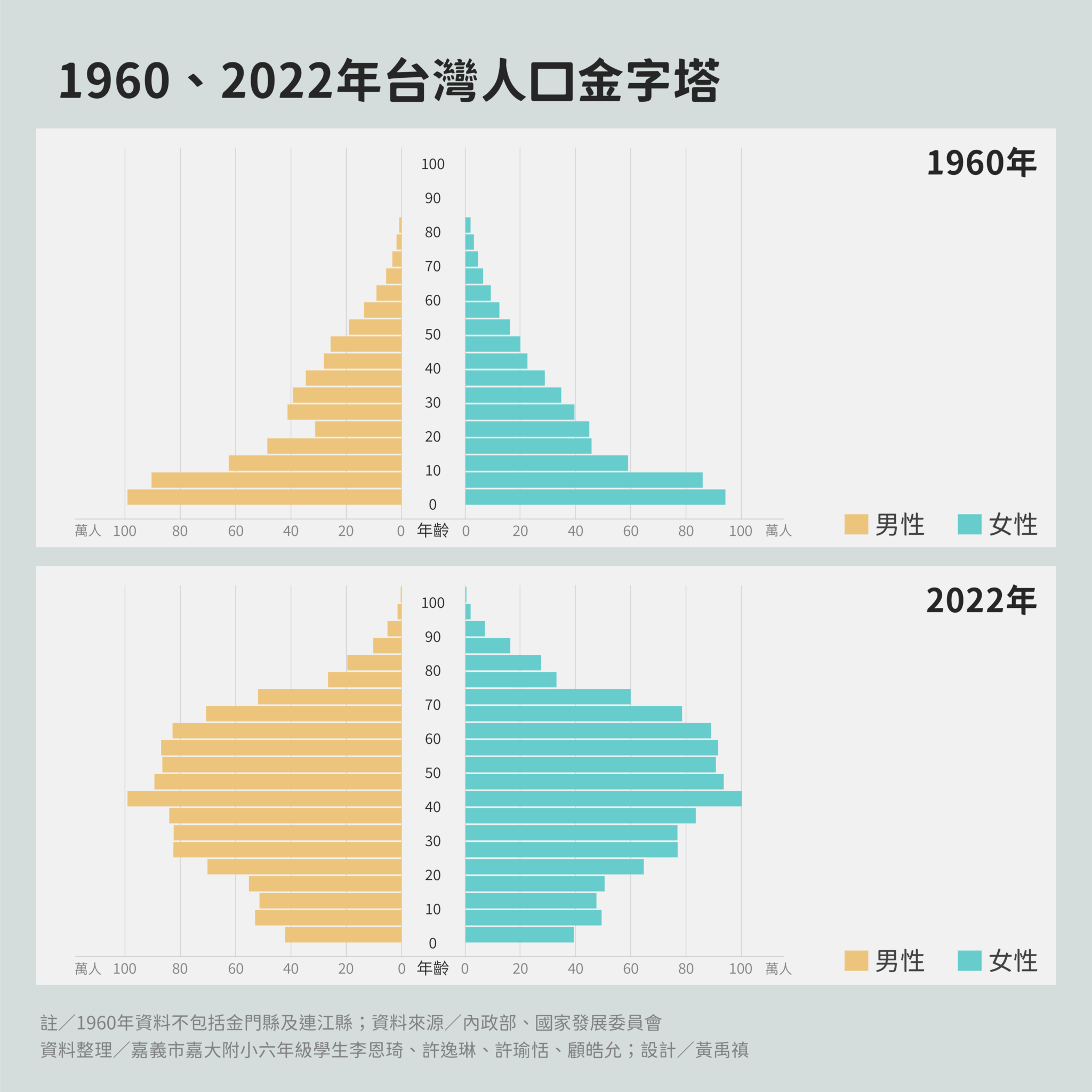 從上圖可以發現,我國人口比率在1960年為底寬、頂尖的金字塔形,20歲以下的人口較多;近年則為中間大、兩端小的燈籠形,勞動力充沛;推估到了2070年,台灣人口以高齡者為主,社會的負擔較重。另外,台灣平均每位婦女的生育率,在2003年進入「超低生育率階段」,這讓政府在2010年把生育問題視為國安議題。