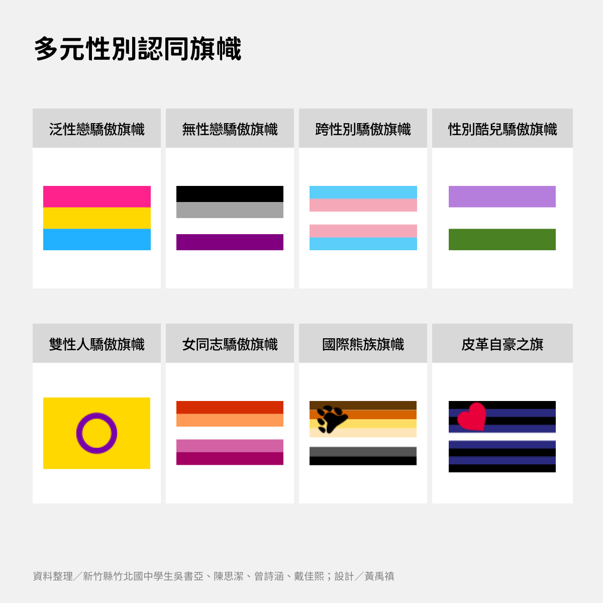 彩虹旗是性別多元認同旗幟中的其中一種,多年來,不同族群也設計了不同的旗幟來代表他們的性別認同,這些不同的旗幟也讓更多人認識他們,多元性別認同旗幟舉例如下: