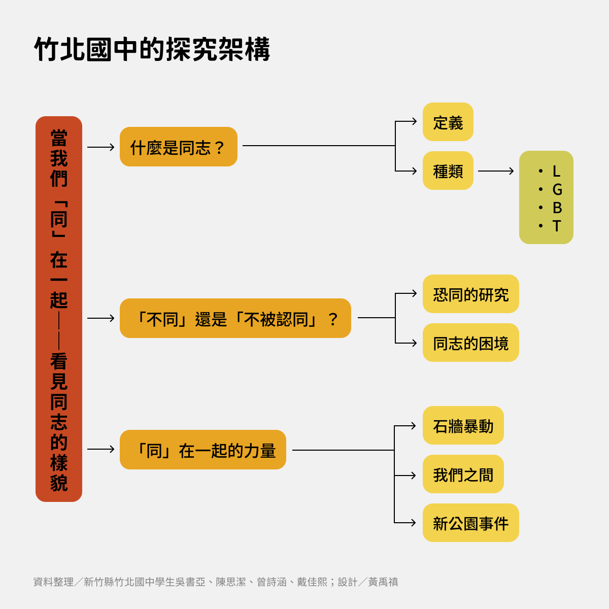 為了深入了解同志及同性婚姻平權,我們經過許多摸索與討論,最後決定了題目以及下列的探究子題,並繪製了架構圖,試圖以更有條理、更有邏輯的方式來了解同性相愛、同性婚姻的發展、世界各地對同志的接受度以及他們長久以來努力的歷程。