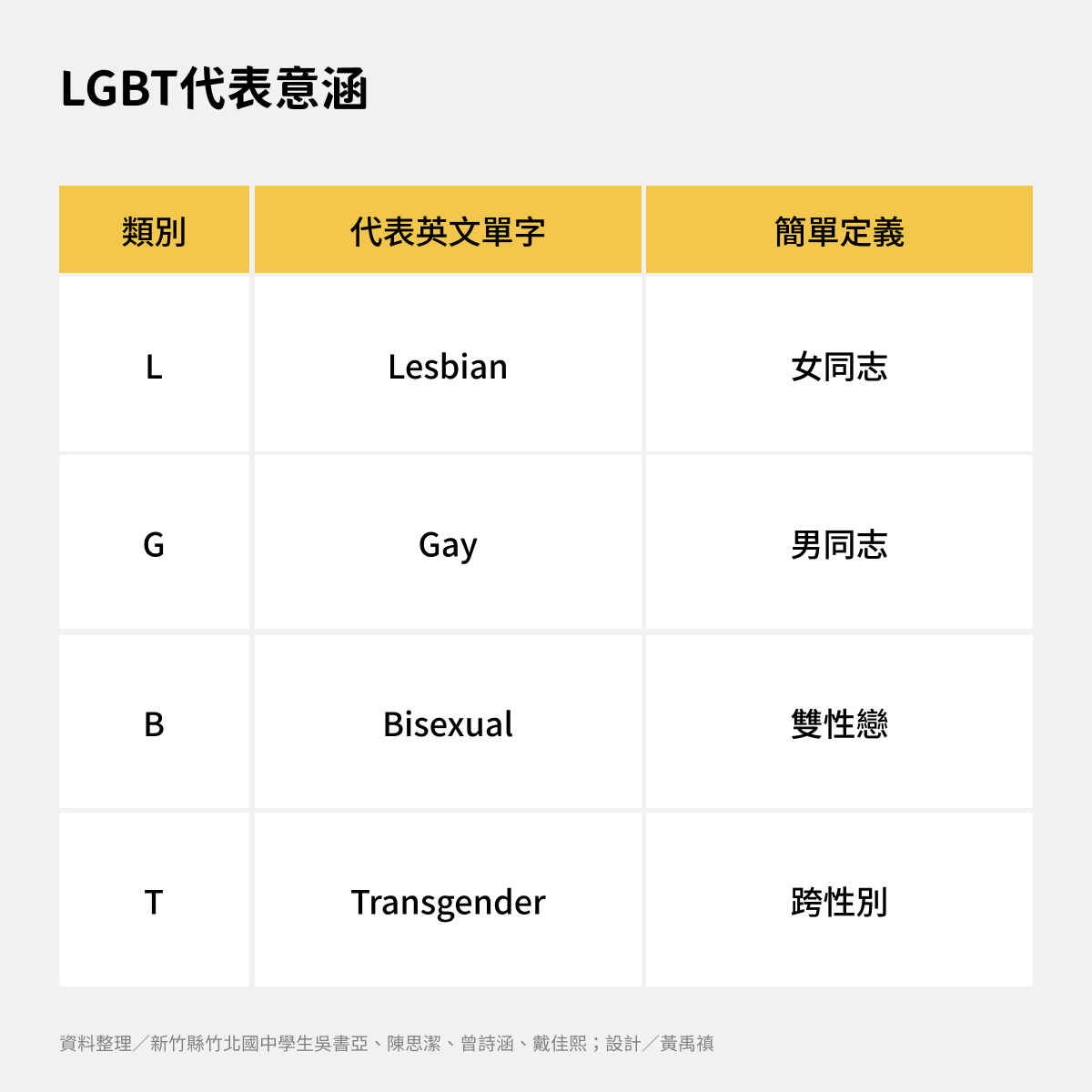 因為「同性戀」一詞無法完整涵蓋相關的族群,於是「LGBT」一詞便應運而生並逐漸普及。「LGBT」代表各種同志的族群,合起來就是同志群體的總稱,不同字母分別是不同英文單字的縮寫,各自代表不同的同志類別,整理如下表: