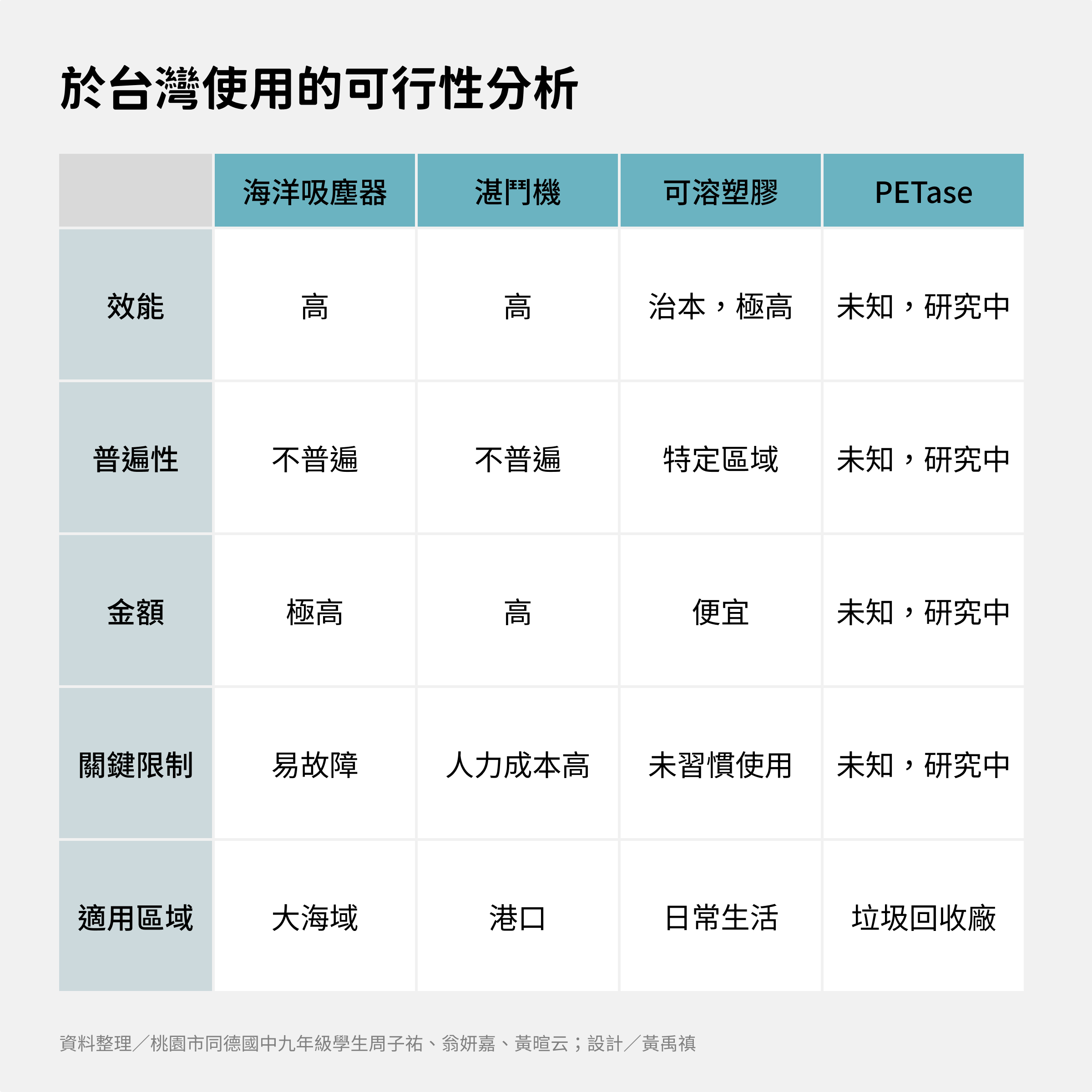 如果台灣可以接受這幾項科技的限制和特點,海洋吸塵器適用在大海域,湛鬥機在港口,可溶塑膠適用於日常生活,PETase則適用於垃圾回收場,我們相信妥善運用這4項科技,必能減少台灣海洋的垃圾量。