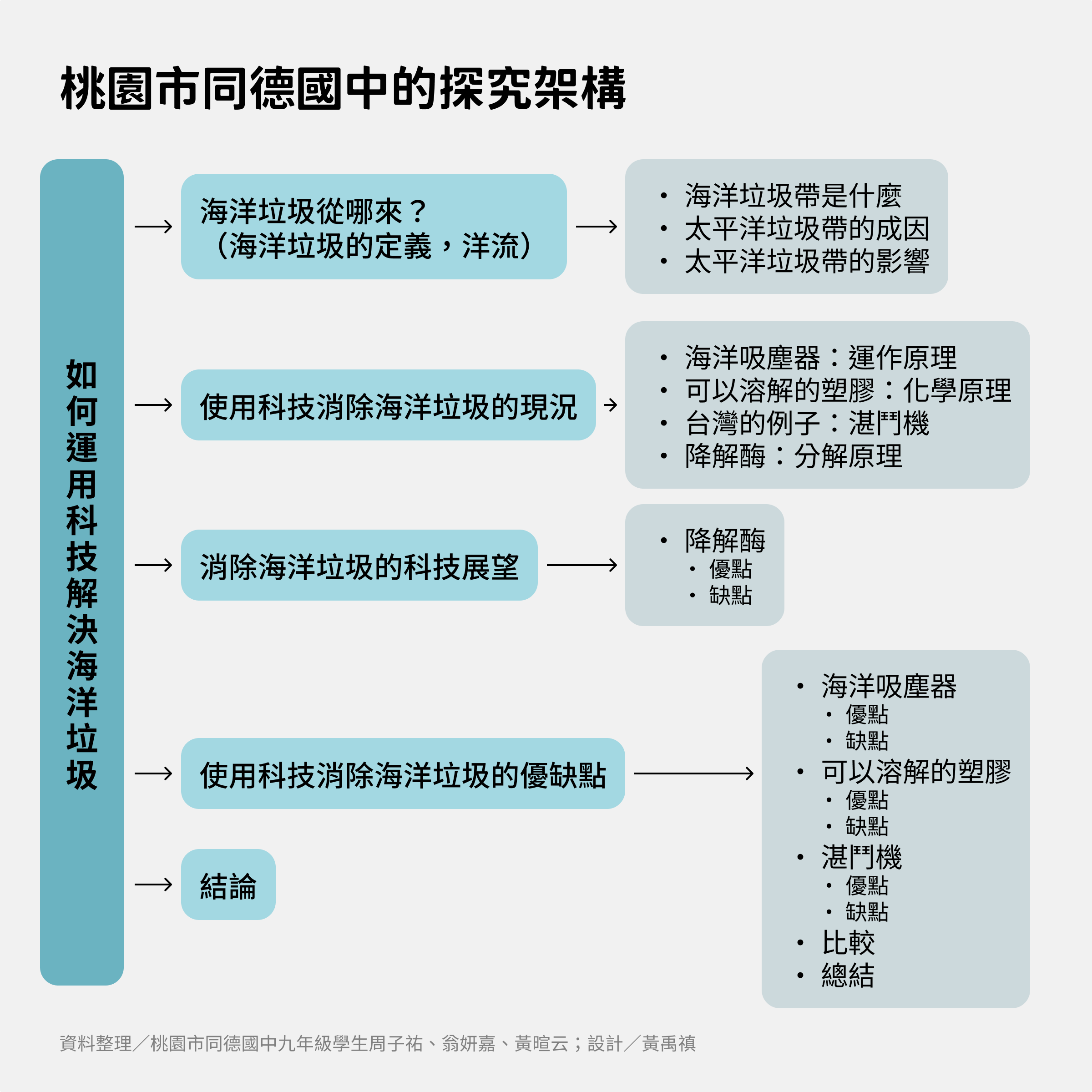 我們從海洋垃圾、現況、優缺點及未來展望四大部分著手分析,除了探討垃圾帶及海洋垃圾帶來的危害,並且提出了四大現代科技──海洋吸塵器、可溶解塑膠、湛鬥機、PETase。由於PETase還在研究中,暫不討論,我們針對其餘三大科技深入剖析其優缺點,也提出未來展望。