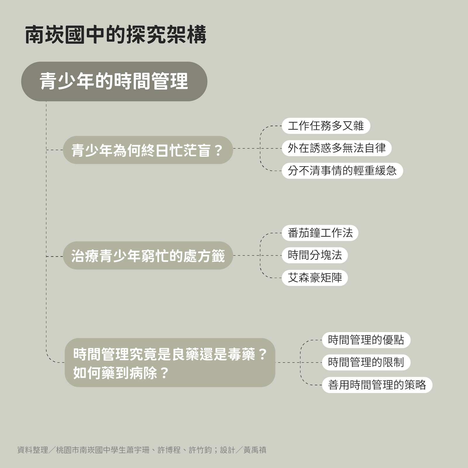 為了找到「青少年時間不夠用」的主因並且想辦法對症下藥,我們以青少年的時間管理為題,搜尋適合青少年的時間管理法則。最後,我們針對青少年如何善用時間管理法則給出了一些建議,期望這些理論更能精準應用需要時間管理的情境,改善青少年在時間管理上的「忙茫盲」。