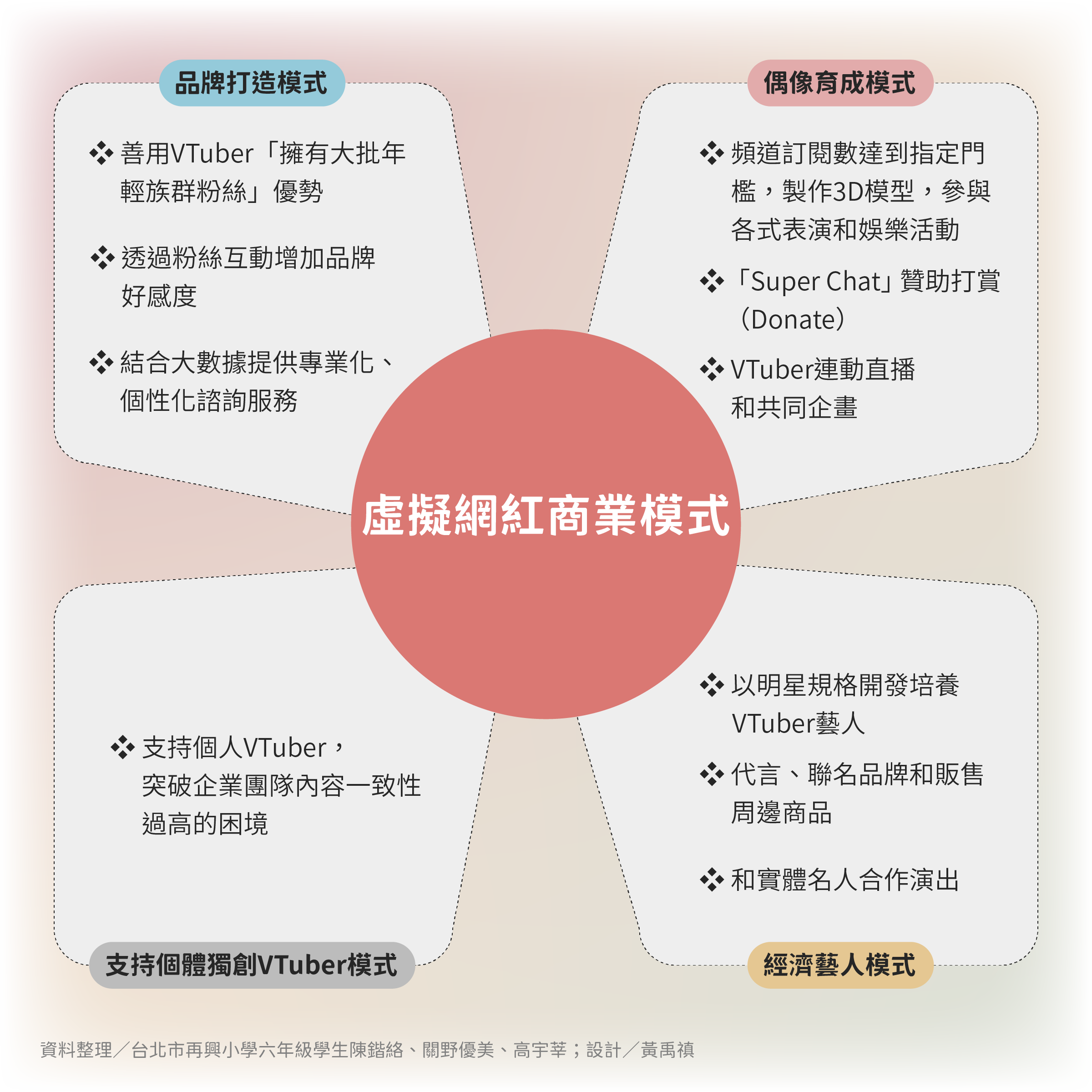 虛擬網紅的商業經營模式主要有偶像育成、經紀藝人、品牌打造、支持個體獨創4種模式,重要的共同點是非常重視內容行銷模式,所以虛擬網紅人設必須鮮明,以及與粉絲交互過程完全偏向於互動,因此粉絲對VTuber的黏著率較高,而且更願意與他們進行互動。