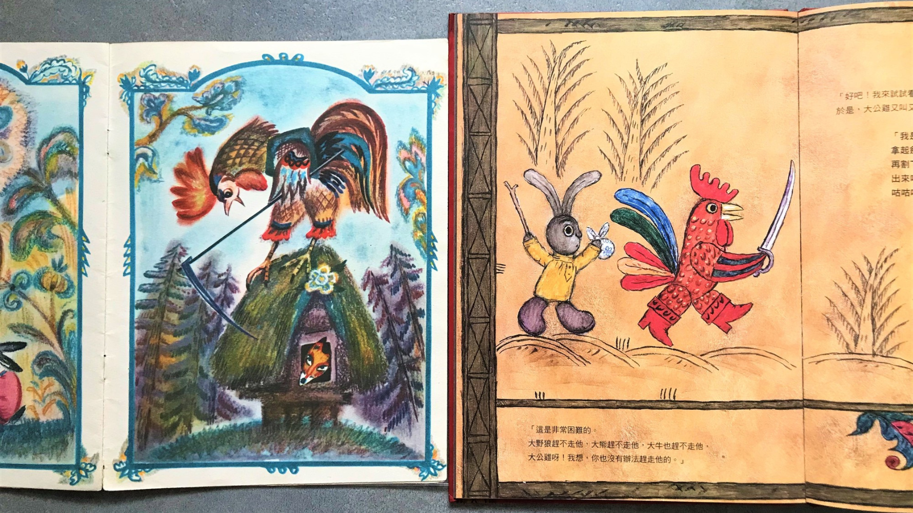動畫導演尤里.諾勒斯堅(Yury Norshteyn)和妻子合作,將這個俄羅斯的民間故事拍成電影,他們融合了俄羅斯的民俗藝術,大量使用鮮豔的色彩與邊框紋樣,讓人感受到濃郁的異國風情。這本繪本由動畫改編而成,動畫不僅有聲光效果,畫面呈現方式也大為不同,推薦兩者搭配欣賞,更加有趣。