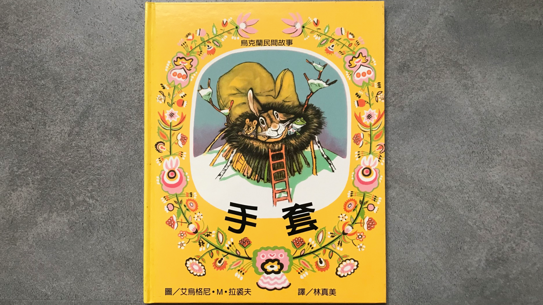 《手套》是烏克蘭最具代表性的民間故事之一,非常多的畫家畫過這個故事。老公公在森林裡散步,走著走著,掉了一隻手套。這時,跑來了一隻小老鼠,他說:「我要住在這裡。」接著,來了一隻小青蛙,小老鼠很大方,讓小青蛙一起住進來。兔子也來了,手套裡的動物愈來愈多、愈來愈擠⋯⋯最後大熊出現了,手套裡已經有7隻動物了!大熊真的塞得進手套裡嗎?有趣的是,在這個故事裡出現了狐狸、野狼、熊等凶猛肉食動物,大家卻能和樂融融擠在一個彷彿無限大的手套裡。俄羅斯也有類似的版本,不過手套變成小木屋或是一個小水罐,但是最後大熊壓垮了整間小屋,結局的處理相當不同。
