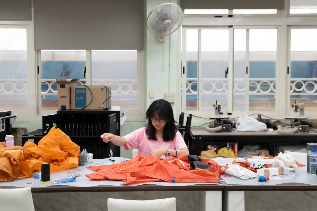 用來降低火箭下墜速度的降落傘也很特別,是即將升大四的副隊長薛博升親手縫製。他上網買風箏布、找教學影片,做好降落傘後,把它們從學校10樓往下丟,計算不同傘型的落地速度,展現十足的科學精神。