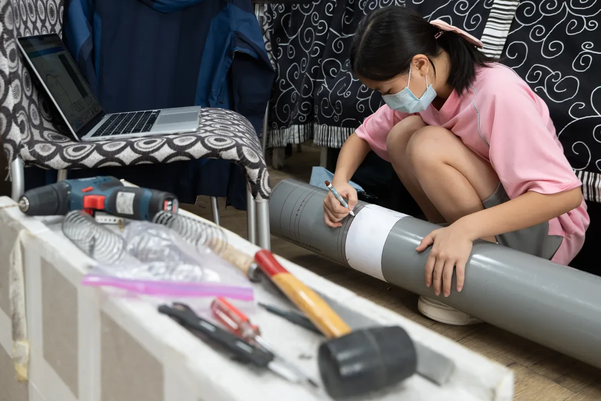 比人還高的塑膠水管,外層噴滿了白色噴漆,構成火箭本體;BB槍裡的二氧化碳氣瓶,與3D列印的零件結合,則化身火箭在空中開啟鼻錐的機關。