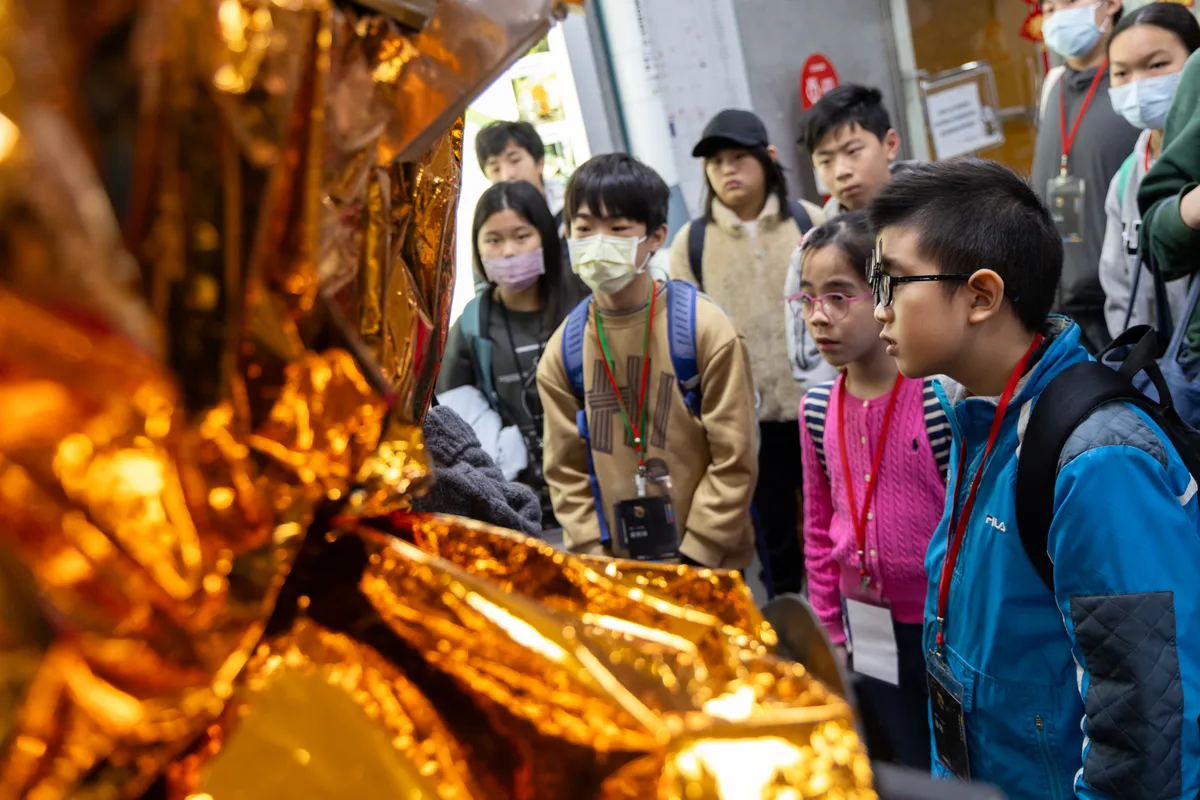 親眼見到今年即將升空的FS-8B,讓小記者群齊聲驚嘆。小記者簡語星直呼:「好幸運!」小記者鄭芮竹說,真正看到FS-8B「本人」,而且還是完全打開的狀態,「覺得很酷,一般人沒有機會看到,原本只存在想像裡的東西,突然出現在眼前,距離變得好近。」