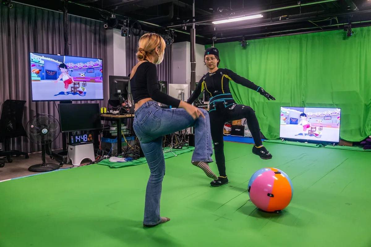 《少年報導者》記者實際走進動捕棚,體驗VTuber的3D變身之旅。在科碼新媒體專案經理Mona的指導下,我們擔任中之人,穿上緊身衣,全身關節處共黏上77顆反光球,目的是要讓光學系統感測到。透過攝影機的捕捉,人體的一舉一動幾乎無延遲地反應在角色上,在虛擬空間自由移動,就像和螢幕裡的VTuber合為一體。