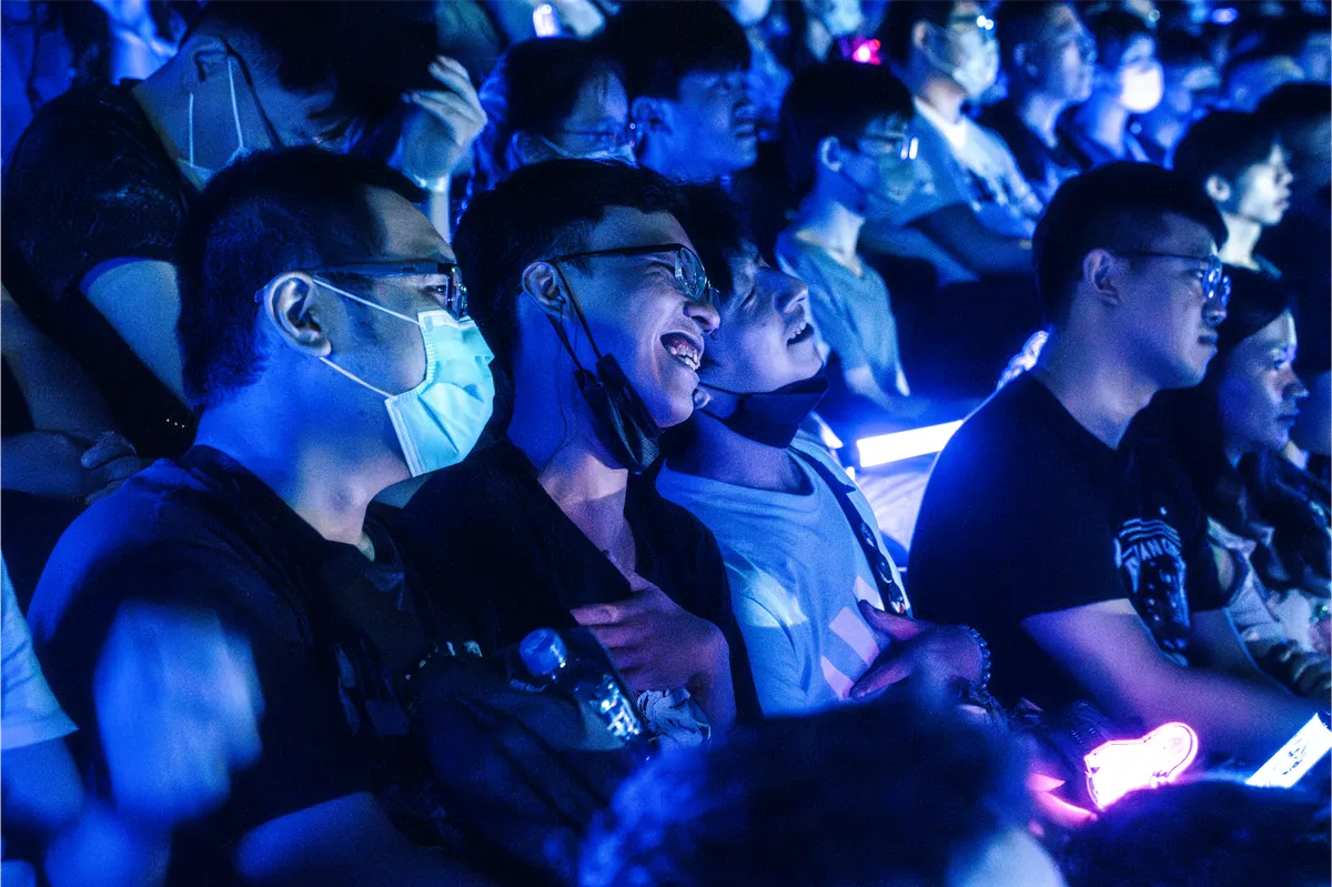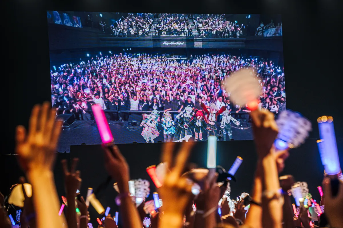 在舞台正上方的轉播畫面,觀眾可以看見自己揮舞螢光棒「打call」應援的影像和VTuber同框,像是身處同一個時空;當台上的VTuber轉身背對觀眾,轉播同步顯示全場一起面對鏡頭的大合照。台下粉絲們目不轉睛地注視著巨大螢幕,見證一場真實與虛擬交織的演出。