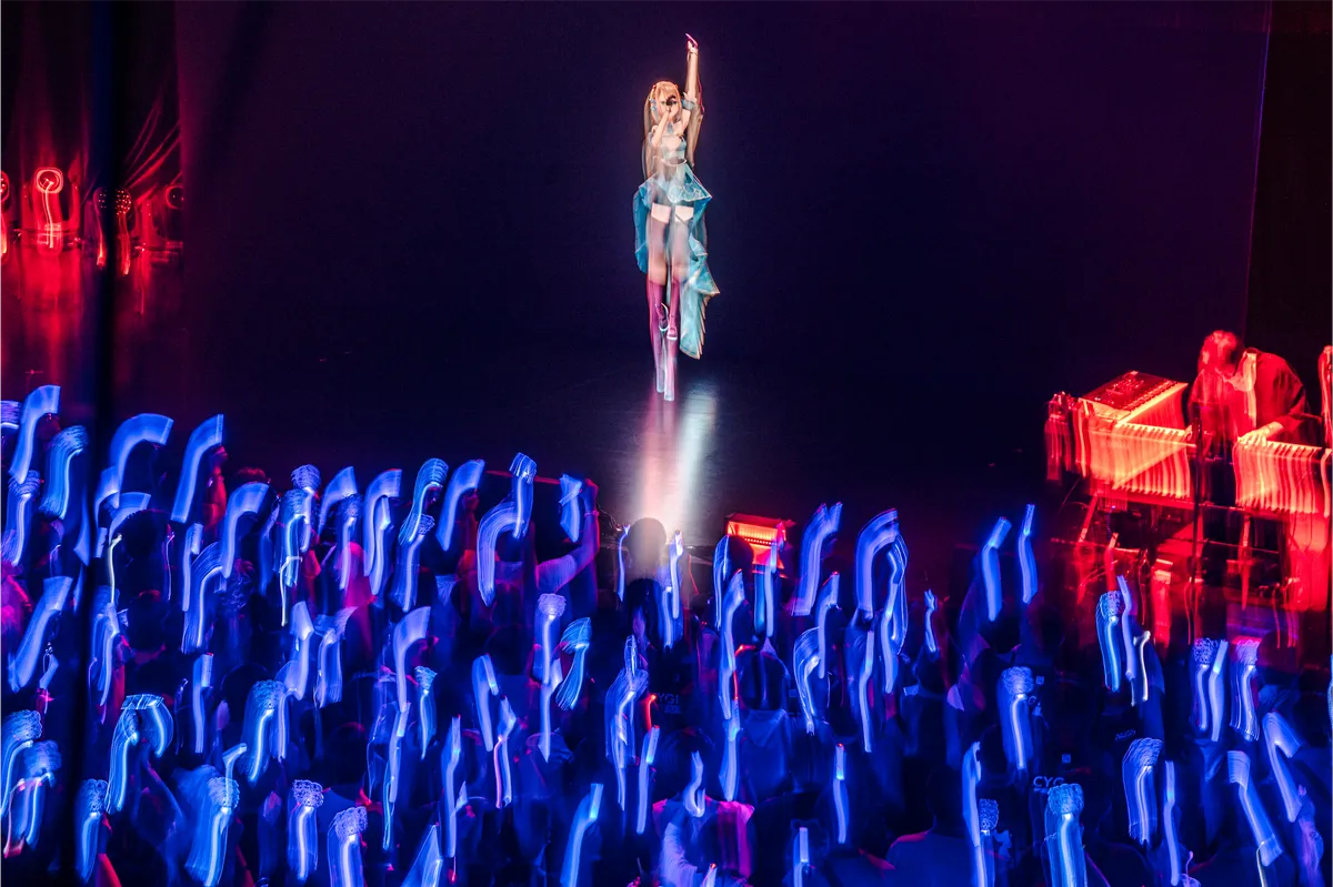 「你們準備好和我一起度過超開心的夜晚了嗎?」女團「極深空計畫」的4位成員「厄倫蒂兒」、「涅默」、「埃穆亞」、「熙歌」,加上2位學姊「露恰露恰」和「歐妲」,從漆黑的LED螢幕中現身,對著台下熱情觀眾呼喊。她們是VTuber,由幕後「中之人」操控的虛擬偶像。長達2小時的表演,「人」藏身螢幕後方,透過光學式動捕攝影機捕捉動作,即時轉譯為螢幕上的VTuber。