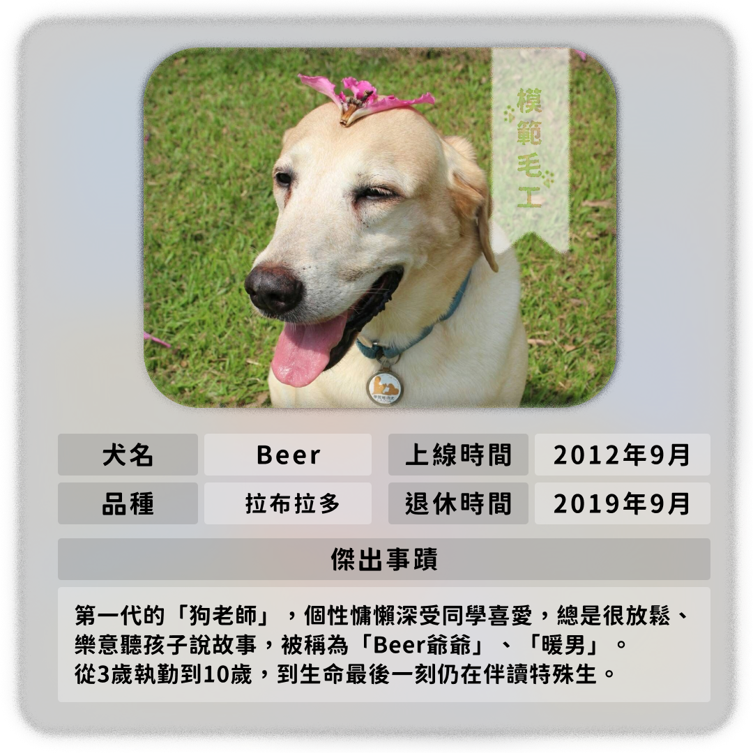 目前第一代學習輔助犬Baby、Bruce與Bonni都已經退休,這3隻貴賓犬已由種子教師領養回家照顧,其中Baby以服務9年的時間,創下最長服役紀錄。另外還有隻拉布拉多Beer也是初代元老,與他搭擋過的李立心記憶,跟其他好動愛玩狗狗不同,Beer超貪睡,常常帶到定點牠就趴下來睡著,同學常把牠當成書架,或是趴在牠身上,要念書給牠聽的同學們也會自己解讀:「Beer聽我念故事念到睡著了。」