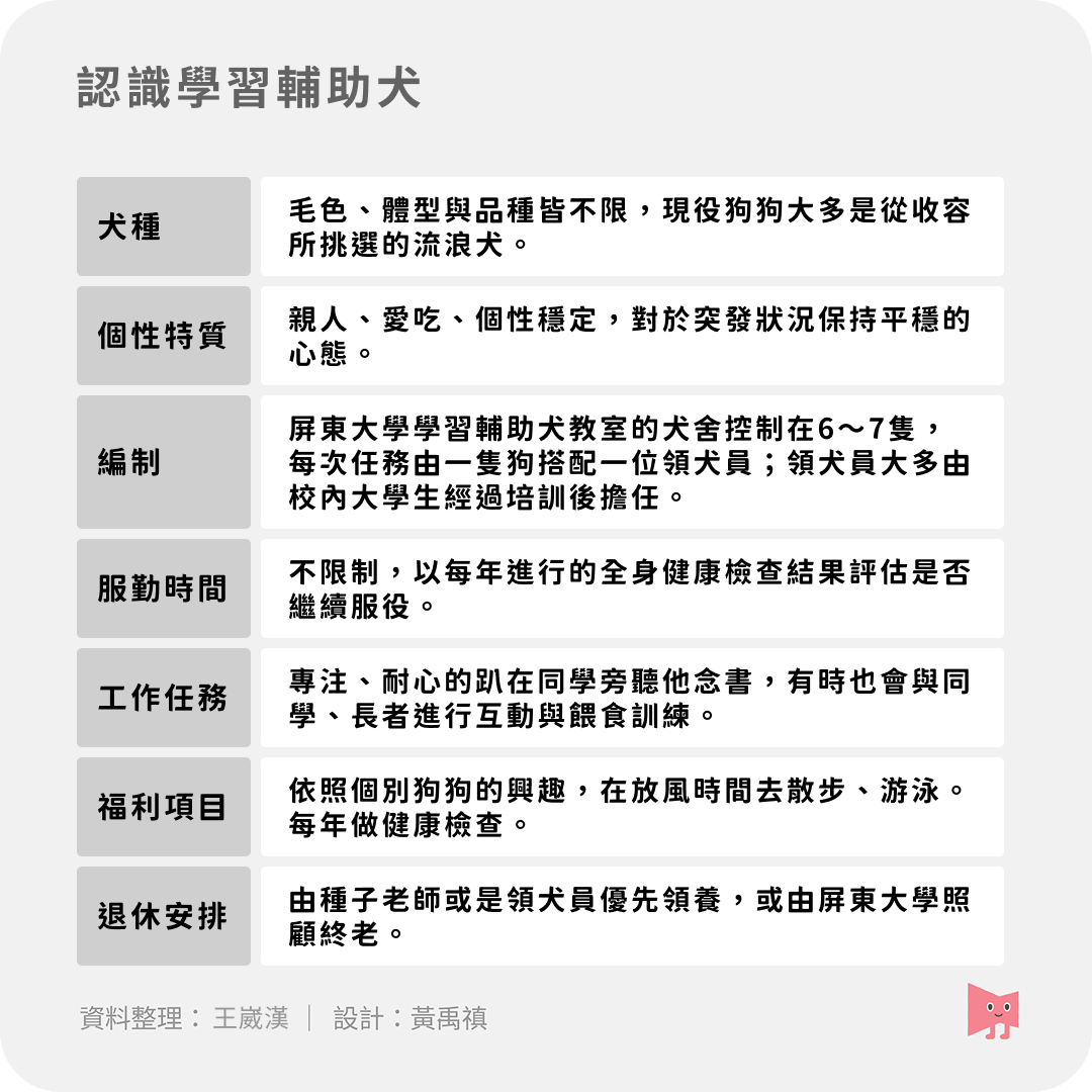 屏東大學絕大多數的學習輔助犬都是從收容所挑選,最重要的標準就是「親人」,因為服務對象是小孩,學習輔助犬不能討厭孩子,或看到小孩接近就想要躲開;再來就是「愛吃」,因為食物是作為訓練中的正向回饋,讓狗狗理解哪些行為是正確的,同時維持牠在工作時的專注與動機。在服務現場,領犬員與老師有時也會引導同學,透過正確的餵食手勢與狗狗互動,讓孩子在安全、低壓力的情境下,學習與動物建立關係。