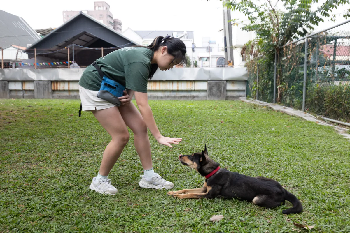 - 跟在腳邊:透過牽繩引導,讓狗狗跟隨在領犬員身旁行走,培養穩定跟隨與合作的能力。