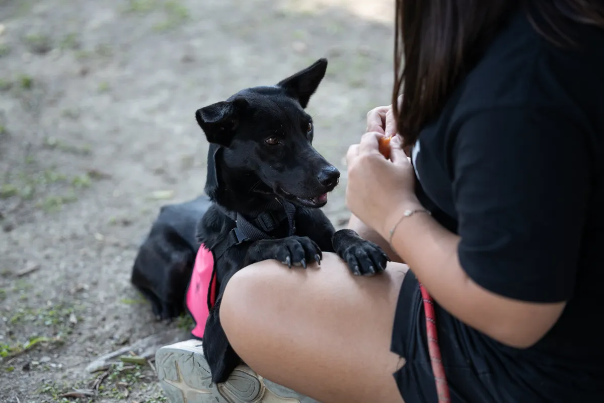 - 趴下:將食物放在較低、甚至必須趴下才能吃到的位置,當狗狗成功趴下時立即給予零食獎勵,並搭配口令「趴」,幫助牠將動作與指令連結。