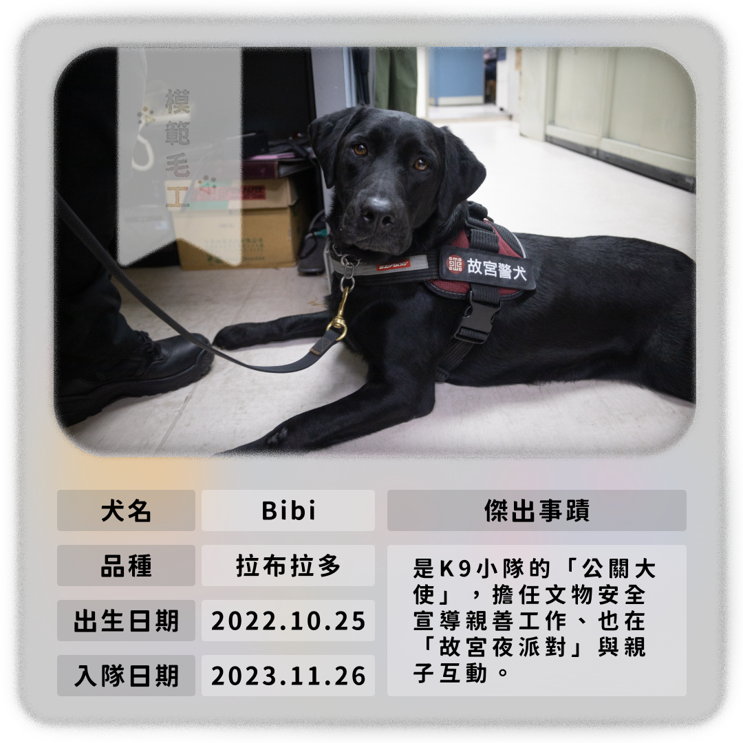 3歲黑色拉布拉多犬Bibi的「鼻子」,在故宮展品還在休息的清晨已經「啟動」,牠是故宮K9小隊的一員,由故宮駐衛警察隊領犬員陳奎銘親手帶大,陪陳奎銘一起接受《少年報導者》的採訪時,Bibi常常把頭抬得高高地,眼睛始終注視著陳奎銘的一舉一動,看起來就像愛黏人的小女孩,但牠其實是故宮國寶守護者之一,用牠的嗅覺偵測可疑的爆裂物。