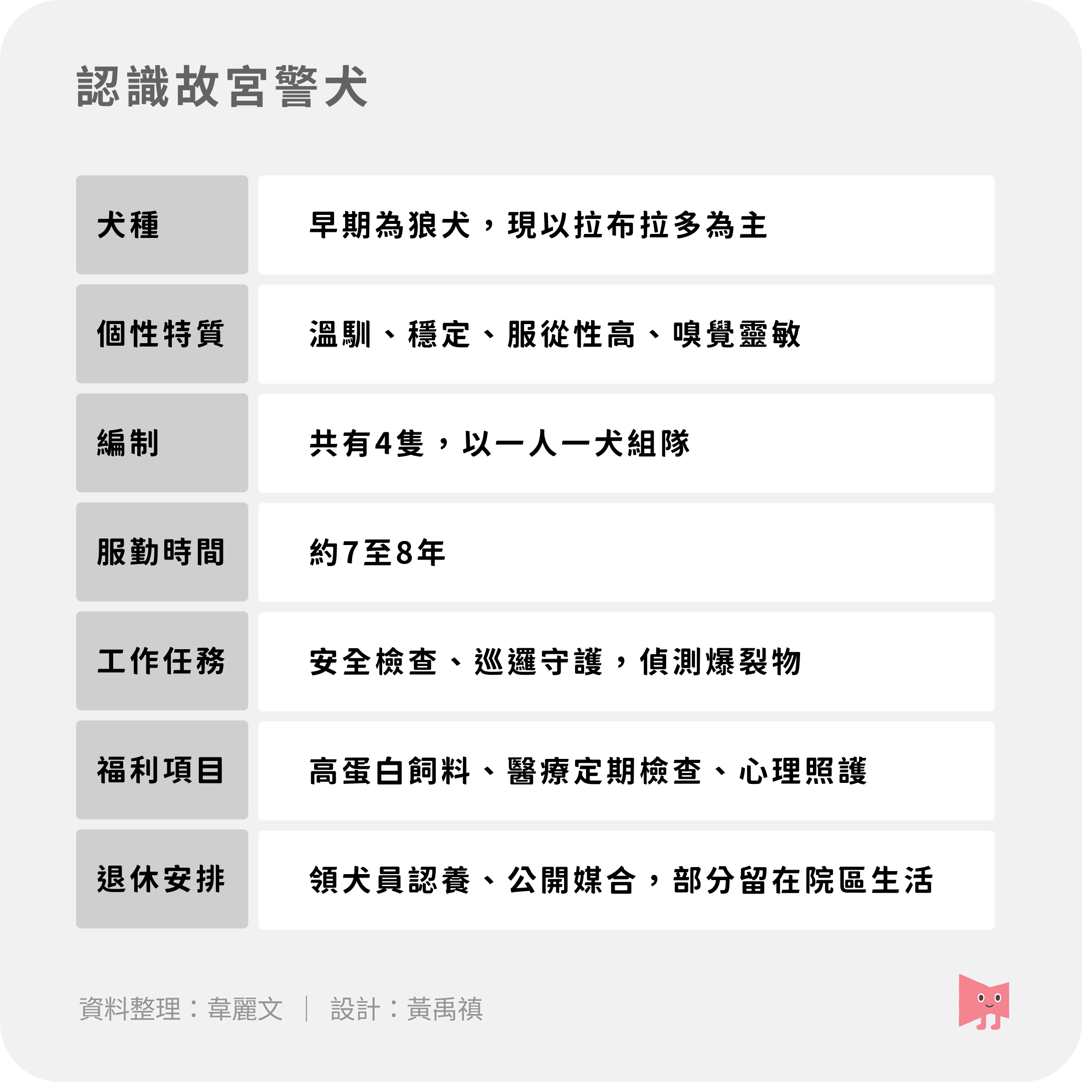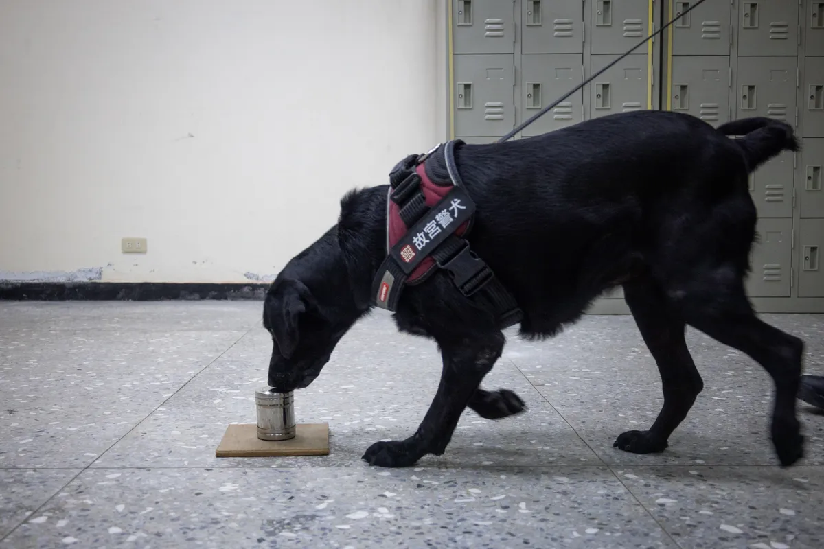 早期的「前輩犬」多為狼犬,訓練重點是「咬、補」,牠們速度快、威嚇性強,主要任務是阻止盜竊者。但隨著遊客增加、氛圍改變,如此威武的犬種顯得不適合在密集人潮中活動;故宮警犬隊近年也進行「形象與任務轉型」,以外型親和的拉布拉多為主力,工作重點也轉向偵測火藥與爆裂物,成為牠們最重要的專業能力。