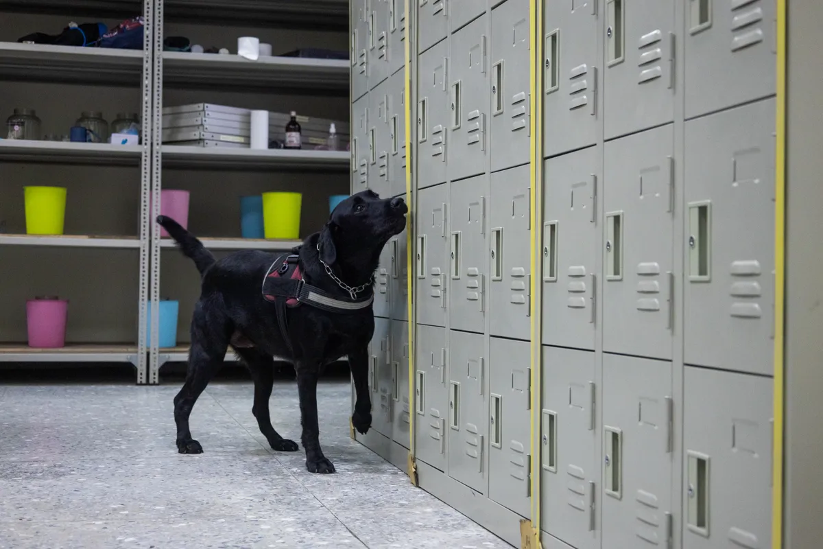 但如果偵爆犬長期找不到東西,難免「自我懷疑」。因此,領犬員會不定時在置物櫃裡放置沾有火藥味的棉花,確認犬隻的偵測能力,也維持牠們找東西的熱情。有時也會加入干擾物,例如布娃娃、塑膠袋或雜物,來增加難度,也讓訓練更貼近日常環境。