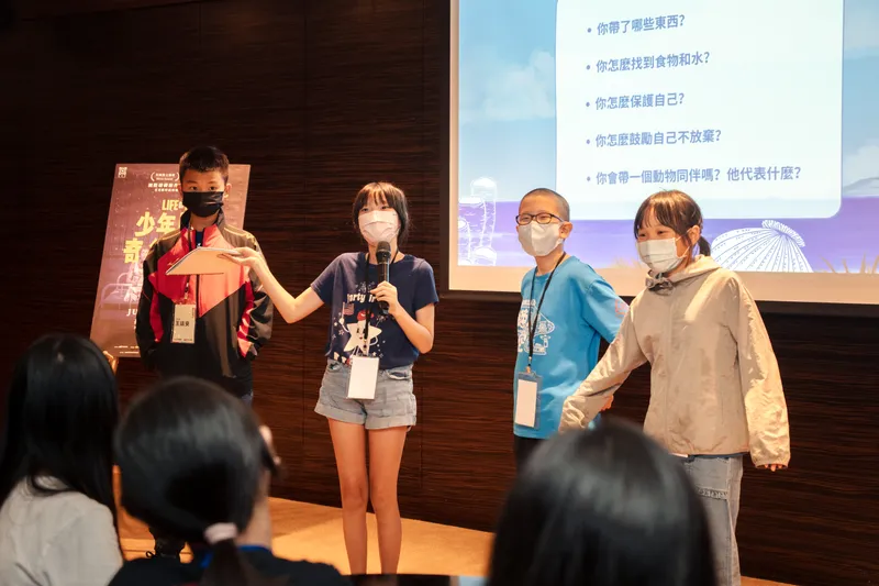 《皇冠出版社》總編輯許婷婷為小記者們導讀《少年Pi的奇幻漂流》小說,從文學的角度進入Pi的世界,也帶領小記者變身少年Pi,提出「生存計畫」。